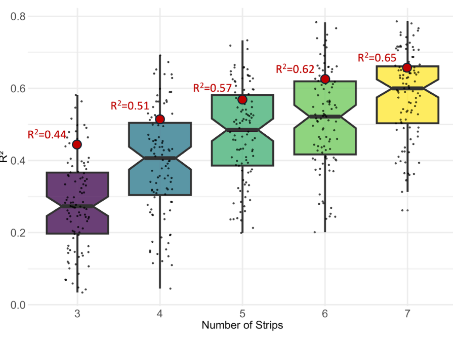 After hundreds of repeated trials, planting sentinels in a random pattern consistently outperformed planting sentinels in strips. With a random distribution, sentinels only need to take up 12% of the field to achieve an average R2 of 0.5. For strip distributions, the required sentinel density is closer to 18%. Therefore, random distribution is most optimal because it achieves greater R2 values at lower sentinel densities.
