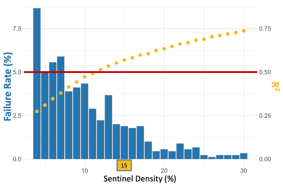 From the graph above, we see that as the number of sentinels increases, the kriging failure rate decreases. The quality benchmarks in this experiment are represented by the red line: mean R2 greater than 0.5 and a kriging failure rate less than 5%. We found that 12% is the minimum density needed to achieve both of these benchmarks. However, in the real-world, sentinels will not be perfect reporters. Therefore, to account for small amounts of measurement error (~15%), we establish that the optimal sentinel density should be 15% for robustness.