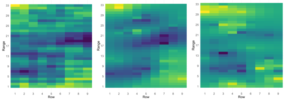 In my project, I generated kriging heatmaps from thousands of random field patterns, each with various distributions and densities of sentinels. I narrowed down my focus to two sentinel distributions, or planting patterns, that would be the easiest for farmers to implement: randomly planting sentinels throughout the field or planting sentinels in strips along the field.